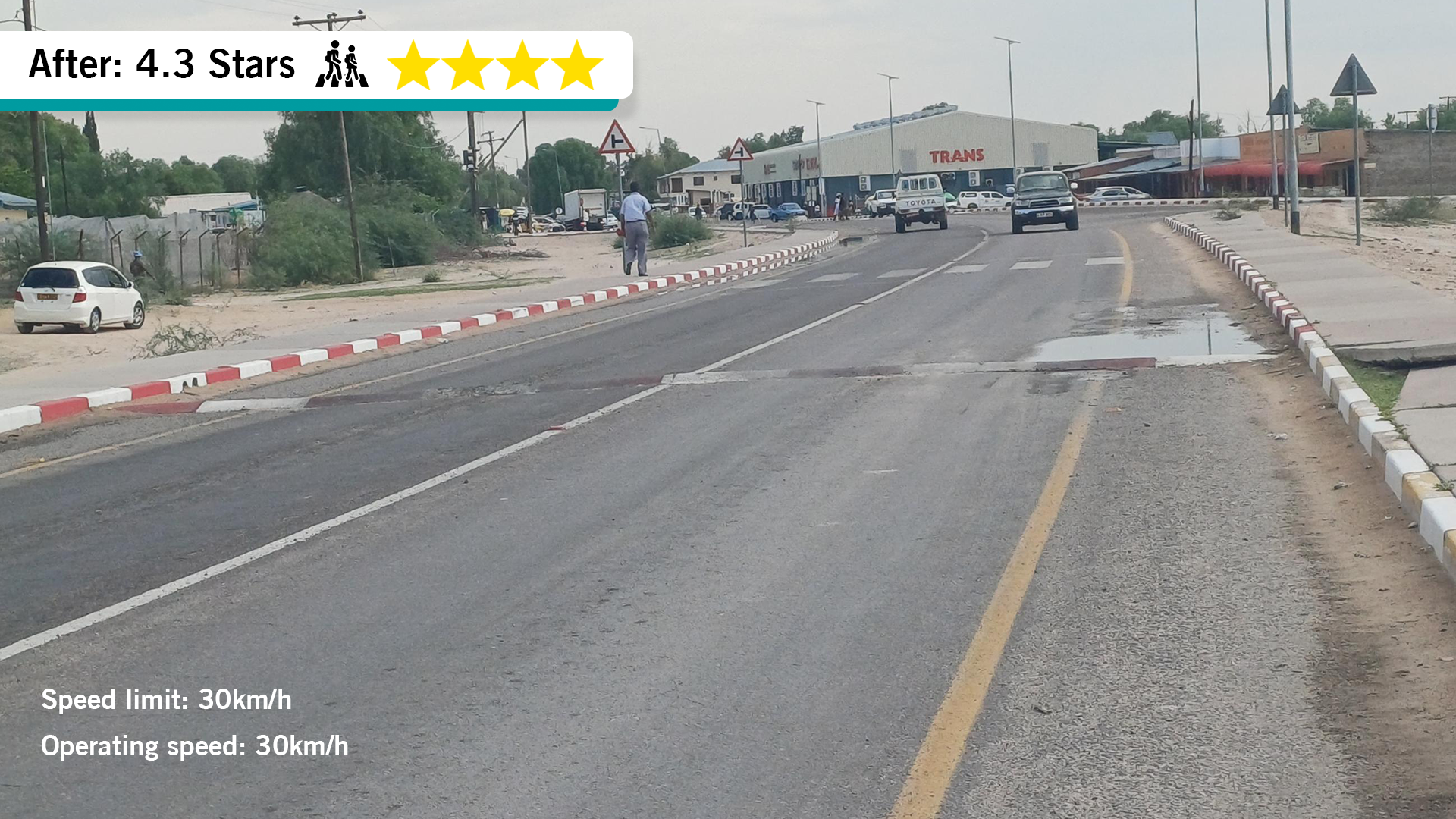 At baseline, the school entrance was rated 3.8 stars due to several safety concerns, including the absence of essential signage, inadequate pedestrian crossing facilities, lack of speed calming measures, and vehicle speeds frequently exceeding the legal limit of 30 km/h.