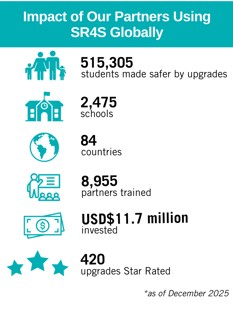 वर्ष 2025 के समापन के अवसर पर, SR4S संस्थापक प्रायोजक के महत्वपूर्ण सहयोग को स्वीकार करता है।, 1 टीटी 7 टी, मेजर डोनर 1 टीपी 6 टी, और वैश्विक कार्यक्रम भागीदार प्रूडेंस फाउंडेशन. हम भी धन्यवाद देते हैं शौकीन बोटनारीGoogle org, और हमारा SR4S लीड पार्टनर्स उनके अमूल्य योगदान के लिए। इन साझेदारियों ने प्रेरणादायक उदाहरण प्रस्तुत किए हैं कि कैसे समन्वित कार्रवाई दुनिया भर के विभिन्न संदर्भों और समुदायों में स्कूल सुरक्षा को बदल सकती है।.